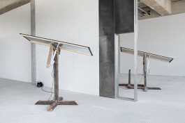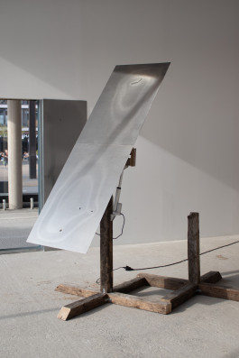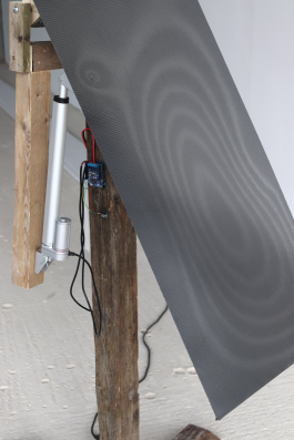 Die kinetischen Objekte in „Flat Orbits“ sind industriellen Solartrackern nachempfunden, die dem vorab berechneten Pfad einer algorithmischen Sonne folgen – abhängig von ihrem Standort. In globalem Maßstab versuchen sie, eine flache, konstante Ebene zu optimieren, die senkrecht zur prognostizierten Sonneneinstrahlung gehalten wird. Die Oberfläche dieser mathematisch optimierten Abstraktion ist in „Flat Orbits“ aktiv: Sie fängt verschiedene Materialien ein und ordnet sie zu flachen Konstellationen – Materialassemblagen, eingebettet und arrangiert in einem algorithmisch regulierten Raum, der digitale und physische Systeme ineinander verschränkt. Sie bleiben nicht statisch, reagieren auf das real einfallende Licht, die Bewegung der Skulpturen und der Betrachtenden.