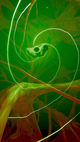 Ein immersives, spielbares Erlebnis, das die Intimität zwischen Körpern verschiedener Spezies erkundet, die durch Hitze kanalisiert werden. In Gestalt eines biolumineszierenden Bakteriums windet sich der Spieler durch das Netz des Lebens, zwischen Mikrokosmos und Universum. Das Spiel wurde in einer auf Körpertemperatur erwärmten Umgebung gespielt und auf einen, den/die Spieler:in umgebenden holographischen Vorhang projiziert.